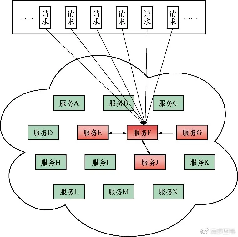 微服务落地到实际项目中,服务的数量往往非常多,服务之间的相互依赖性也是错综复杂的,一个网络请求通常需要调用多个服务才能完成。如果一个服务不可用,例如网络延迟或故障,会影响到依赖于这个不可用的服务的其他服务。如图1-4所示,一个微服务系统有很多个服务,当服务F因某些原因导致了服务的不可用,来自于用户的网络请求需要调用服务F。由于服务F无响应,用户的请求都处于阻塞状态,在高并发的场景下,短时间内会导致服务器的线程资源消耗殆尽。另外,依赖于服务F的其他的服务,例如图中的服务E、服务G、服务J,也会等待服务F的响应,处于阻塞状态,导致这些服务的线程资源消耗殆尽,进而导致它们的不可用,以及依赖于它们的服务的不可用,最后导致整个系统处于瘫痪的状态也就是1.2.1节中提到的雪崩效应。