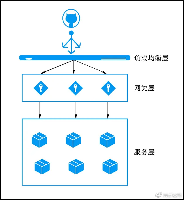 微服务系统通过将资源以API接口的形式暴露给外界来提供服务。在微服务系统中,API接口资源通常是由服务网关(也称API网关)统一暴露,内部服务不直接对外提供API资源的暴露。这样做的好处是将内部服务隐藏起来,外界还以为是一个服务在提供服务,在一定程度上保护了微服务系统的安全。API网关通常有请求转发的作用,另外它可能需要负责一定的安全验证,例如判断某个请求是否合法,该请求对某一个资源是否具有操作权限等。通常情况下,网关层以集群的形式存在。在服务网关层之前,有可能需要加上负载均衡层,通常为Nginx双机热备,通过一定的路由策略,将请求转发到网关层。到达网关层后,经过一系列的用户身份验证、权限判断,最终转发到具体的服务。具体的服务经过一系列的逻辑运算和数据操作,最终将结果返回给用户,此时的架构如图1-6所示。