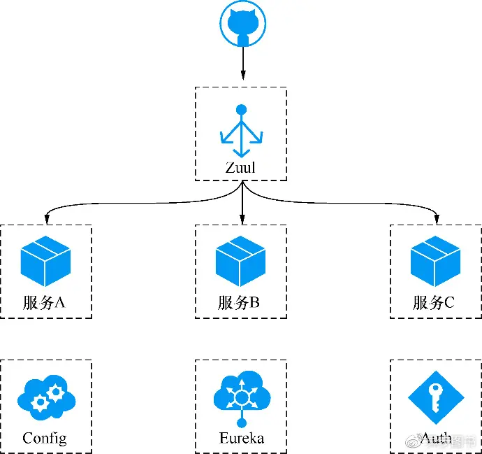 上述列举了一些常用的Spring Cloud组件。一个简单的由Spring Cloud构建的微服务系统,通常由服务注册中心Eureka、网关Zuul、配置中心Config和授权服务Auth构成,架构如图1-9所示。