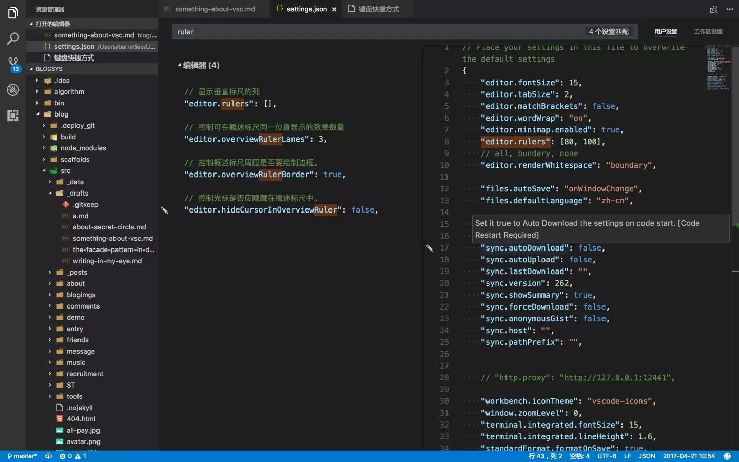以上是用的比较多的,还装了几十个使用频度比较低的插件,主要包括 Snippet 和文件高亮配置,可以在这里查看:gist.github.com/barretlee/a…,你也可以通过 SettingsSync 将这个配置下载下来,id 就是后面半截: a5170eb6ca1805f66687063d2e3a4983。