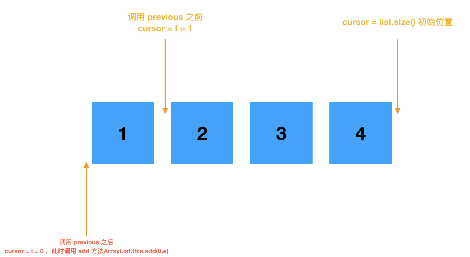 由此可以看 cursor 于 数组角标不同,它可以处的位置总比角标多一个,因为在我们使用 Iterator 操作集合的时候,总是要先操作 cursor 移动, listIterator.previous 也好 iterator.next() 也好,都是一样的道理,如果不按照规定去进行操作,带给使用者的只有异常。