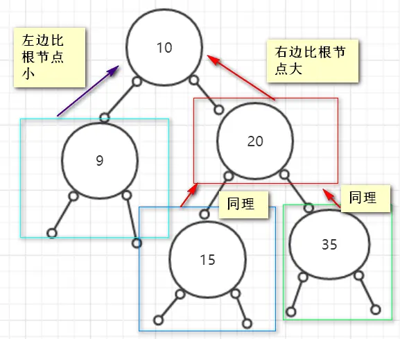 - 定义:当前根节点的左边全部比根节点小,当前根节点的右边全部比根节点大。