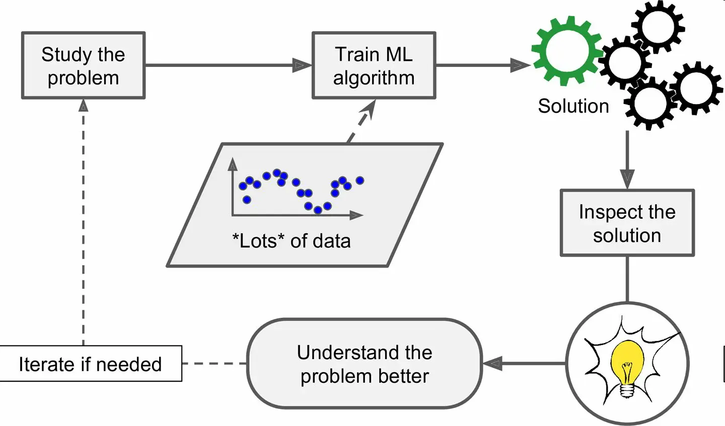 最后,机器学习可以帮助人类进行学习(图1-4):可以检查机器学习算法已经掌握了什么(尽管对于某些算法,这样做会有点麻烦)。例如,当垃圾邮件过滤器被训练了足够多的垃圾邮件,就可以用它列出垃圾邮件预测值的单词和单词组合列表。有时,可能会发现不引人关注的关联或新趋势,有助于对问题更好的理解。