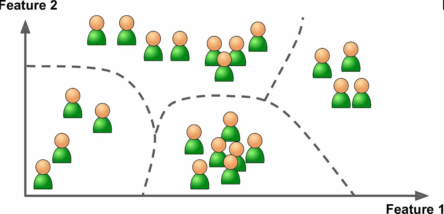 例如,假设你有一份关于你的博客访客的大量数据。你想运行一个聚类算法,检测相似访客的分组(图1-8)。你不会告诉算法某个访客属于哪一类:它会自己找出关系,无需帮助。例如,算法可能注意到40%的访客是喜欢漫画书的男性,通常是晚上访问,20%是科幻爱好者,他们是在周末访问等等。如果你使用层次聚类分析,它可能还会细分每个分组为更小的组。这可以帮助你为每个分组定位博文。