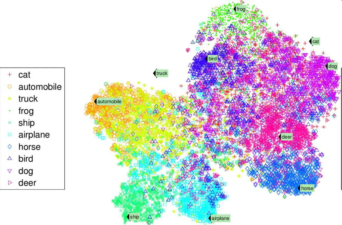 图1-9 t-SNE可视化案例,突出了聚类(注:注意动物是与汽车分开的,马与鹿很近、与鸟院,以此类推)