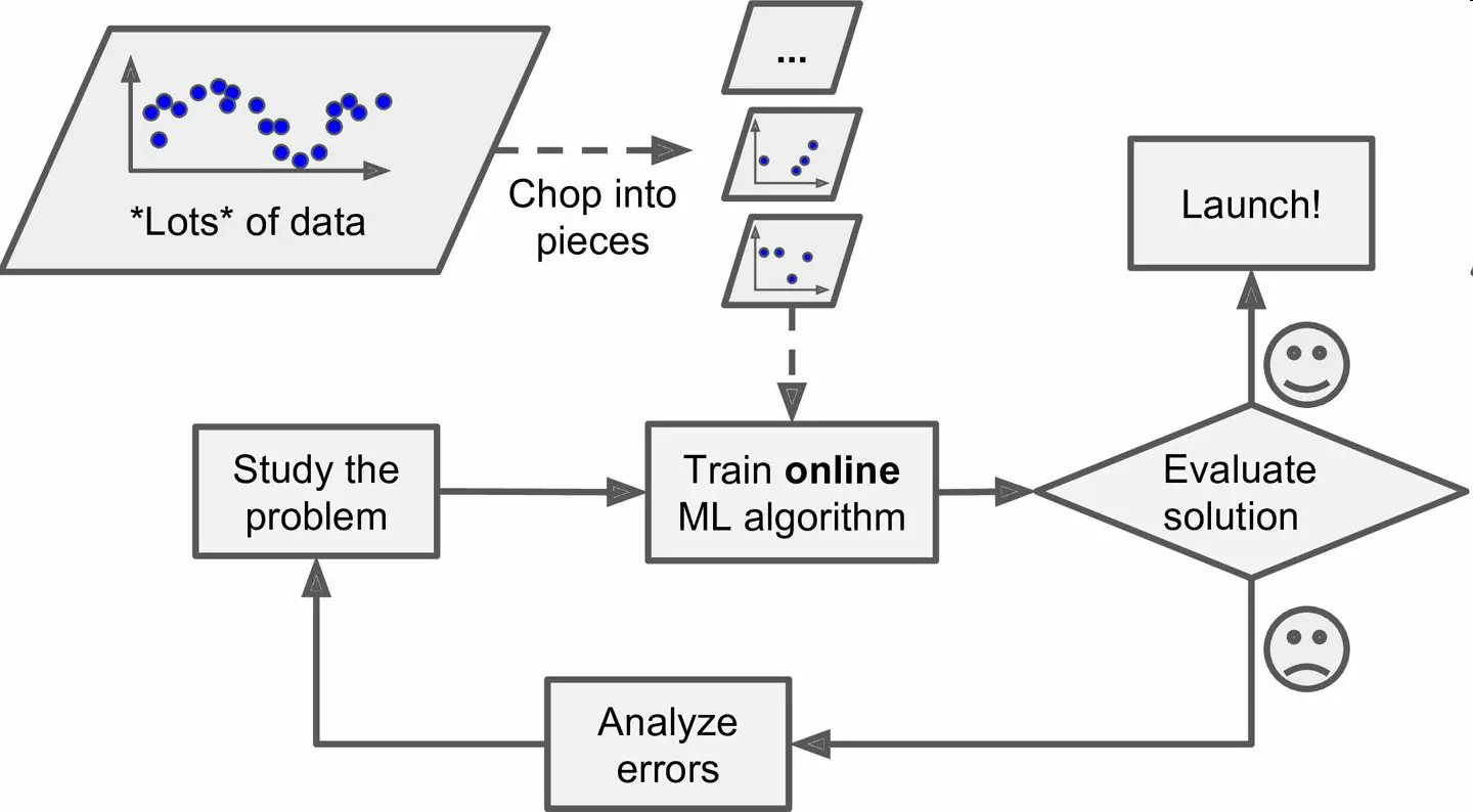 在批量学习中,系统不能进行持续学习:必须用所有可用数据进行训练。这通常会占用大量时间和计算资源,所以一般是线下做的。首先是进行训练,然后部署在生产环境且不带学习,它只是应用学到的。这称为离线学习。