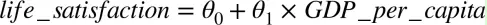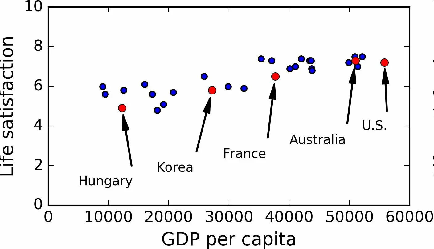 例如,我们之前用来训练线性模型的国家集合不够具有代表性:缺少了一些国家。图1-21展示了添加这些缺失国家之后的数据。