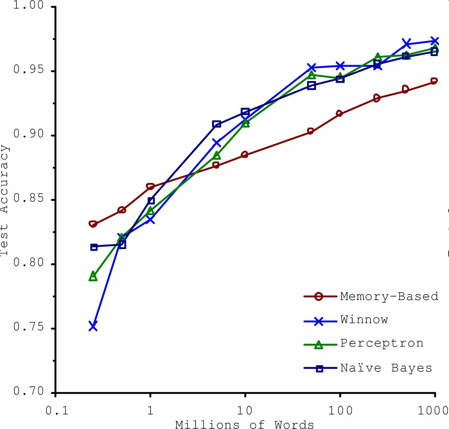 对于复杂问题,数据比算法更重要的主张在2009年由Norvig发表的论文《The Unreasonable Effectiveness of Data》得到了进一步的推广。但是,应该注意到,小型和中型的数据集仍然是非常常见的,获得额外的训练数据并不总是轻易和廉价的,所以不要抛弃算法。