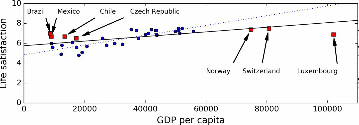 如果你用这份数据训练线性模型,得到的是实线,旧模型用虚线表示。可以看到,添加几个国家不仅可以显著地改变模型,它还说明如此简单的线性模型可能永远不会达到很好的性能。貌似非常富裕的国家没有中等富裕的国家快乐(事实上,非常富裕的国家看起来更不快乐),相反的,一些贫穷的国家看上去比富裕的国家还幸福。