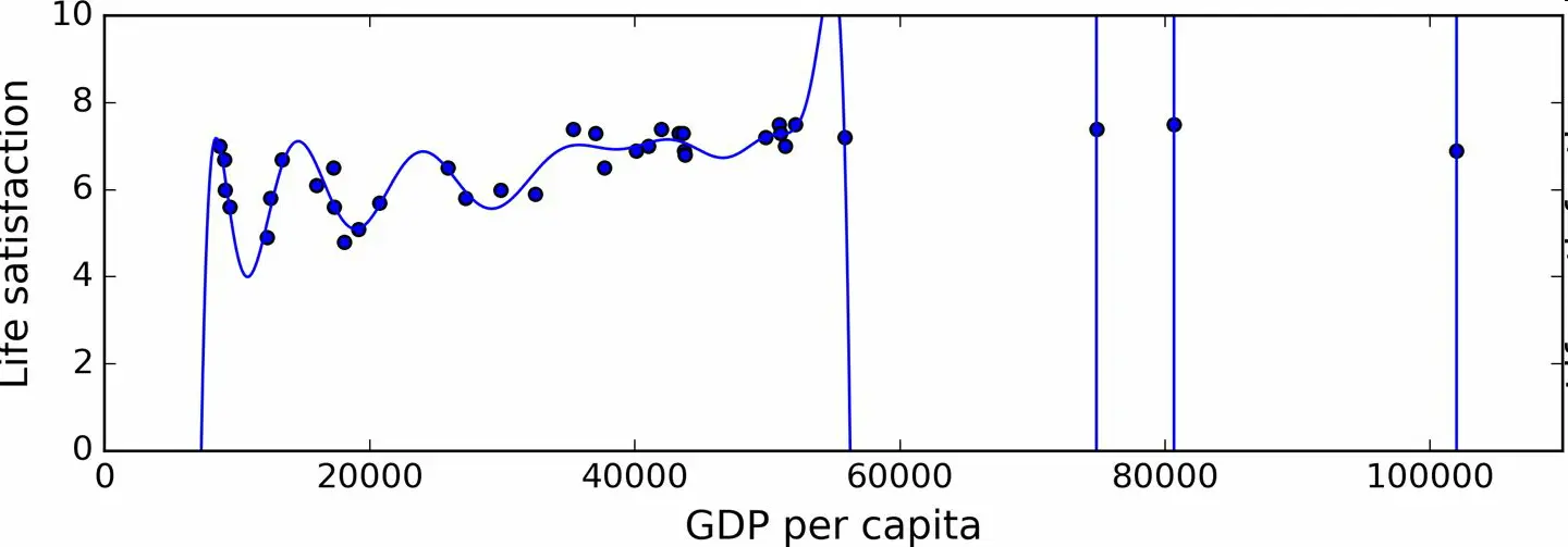 你可能猜到了,欠拟合是和过拟合相对的:当你的模型过于简单时就会发生。例如,生活满意度的线性模型倾向于欠拟合;现实要比这个模型复杂的多,所以预测很难准确,即使在训练样本上也很难准确。