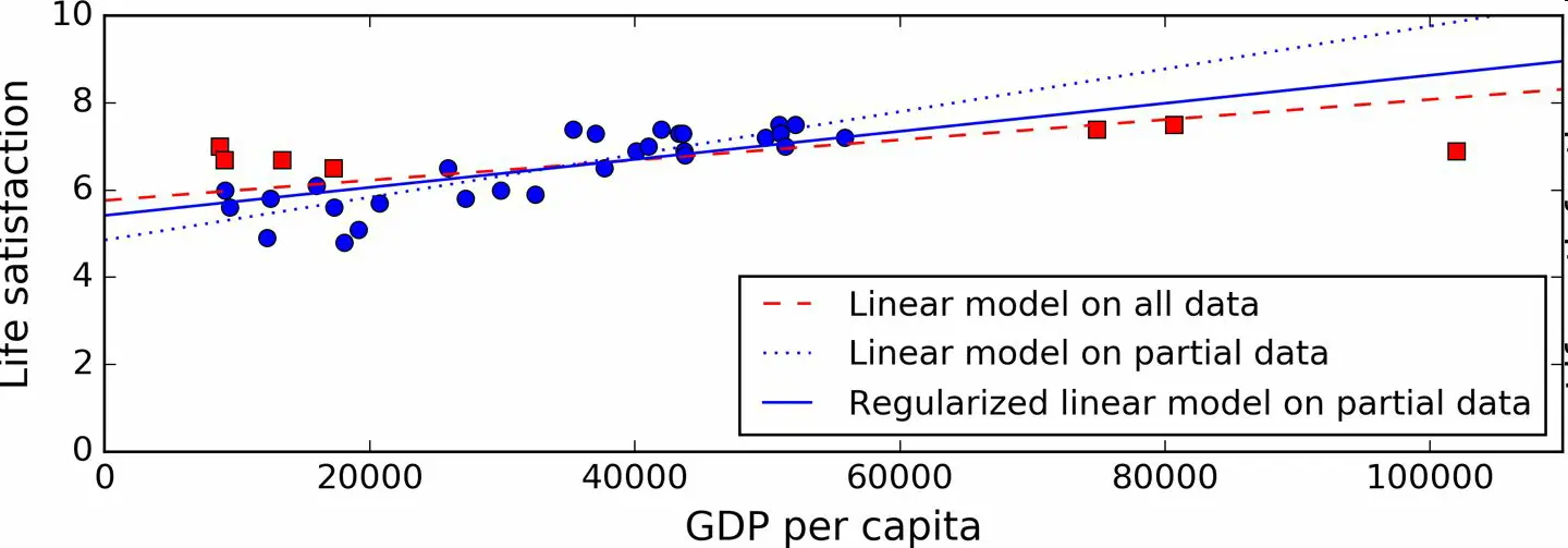 图1-23展示了三个模型:虚线表示用缺失部分国家的数据训练的原始模型,短划线是我们的第二个用所有国家训练的模型,实线模型的训练数据和第一个相同,但进行了正规化限制。你可以看到正规化强制模型有一个小的斜率,它对训练数据的拟合不是那么好,但是对新样本的推广效果好。