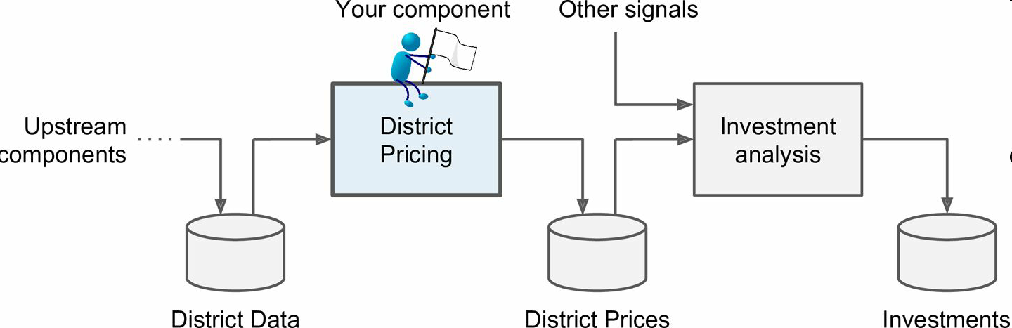 老板告诉你你的模型的输出(一个区的房价中位数)会传给另一个机器学习系统(见图2-2),也有其它信号会传入后面的系统。这一整套系统可以确定某个区进行投资值不值。确定值不值得投资非常重要,它直接影响利润。