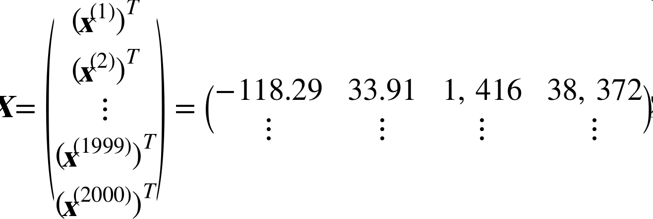 - X是包含数据集中所有实例的所有特征值(不包含标签)的矩阵。每一行是一个实例,第ith行是x(i)的转置,标记为(x(i))T。