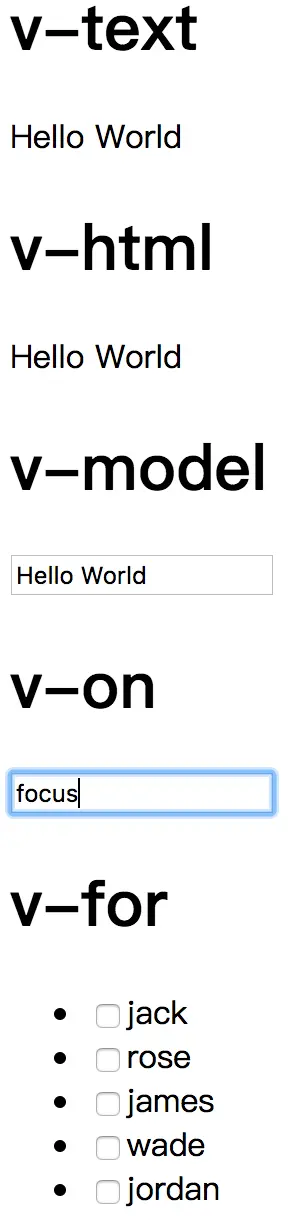 简单实现 v-for、v-text、v-html、v-on 和 v-model 这些功能。