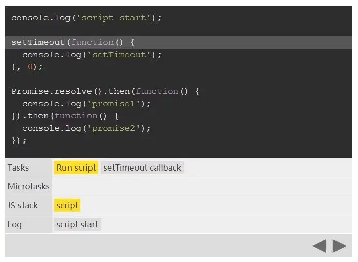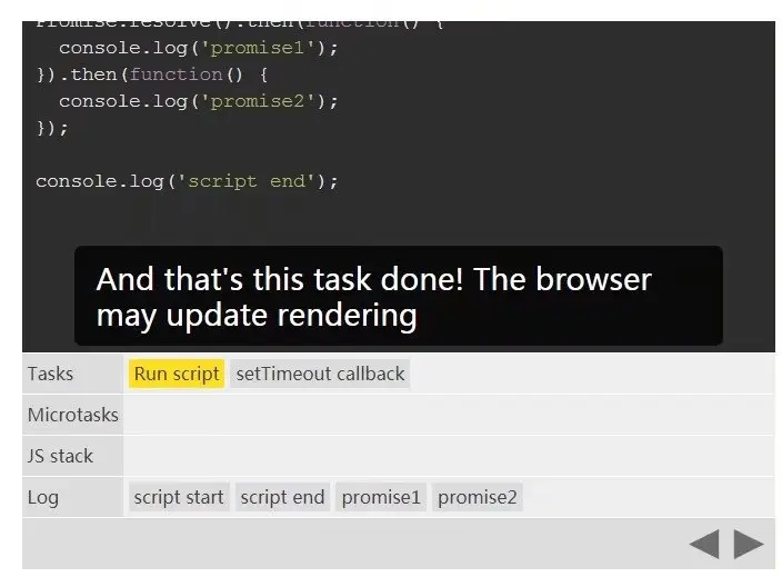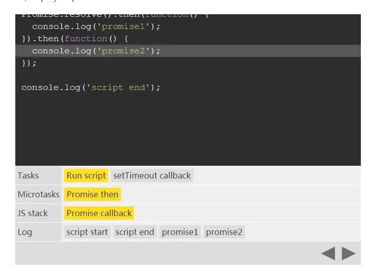 Microtasks(微任务) are usually scheduled for things that should happen straight after the currently executing script, such as reacting to a batch of actions, or to make something async without taking the penalty of a whole new task. The microtask queue is processed after callbacks as long as no other JavaScript is mid-execution, and at the end of each task. Any additional microtasks queued during microtasks are added to the end of the queue and also processed. Microtasks include mutation observer callbacks, and as in the above example, promise callbacks.