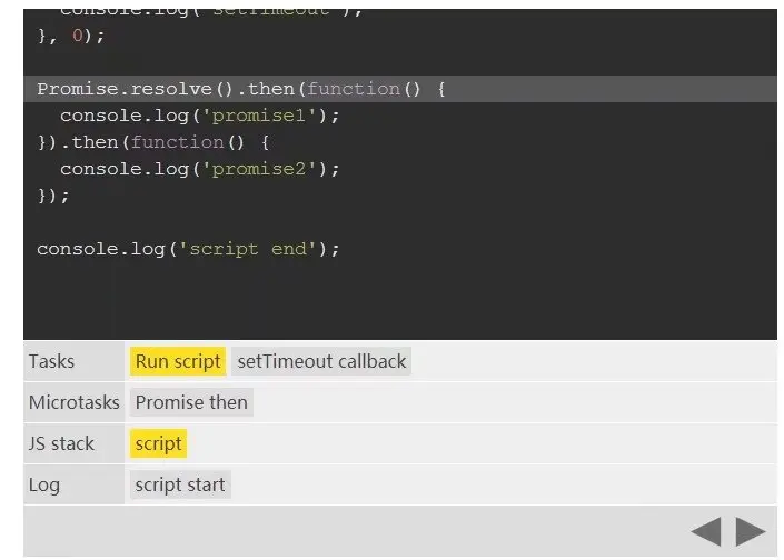 Once a promise settles, or if it has already settled, it queues a microtask for its reactionary callbacks. This ensures promise callbacks are async even if the promise has already settled. So calling .then(yey, nay) against a settled promise immediately queues a microtask. This is why promise1 and promise2 are logged after script end, as the currently running script must finish before microtasks are handled. promise1 and promise2 are logged before setTimeout, as microtasks always happen before the next task."