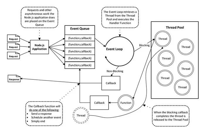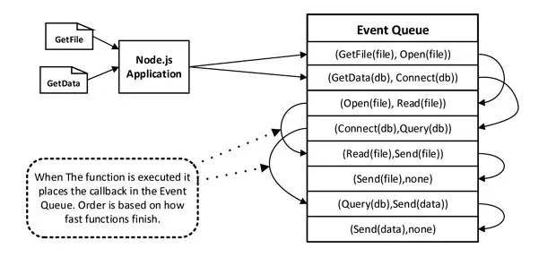 Node采用事件驱动的运行方式。在事件驱动的模型当中,每一个IO工作被添加到事件队列中,线程循环地处理队列上的工作任务,当执行过程中遇到来堵塞(读取文件、查询数据库)时,线程不会停下来等待结果,而是留下一个处理结果的回调函数,转而继续执行队列中的下一个任务。这个传递到队列中的回调函数在堵塞任务运行结束后才被线程调用。
