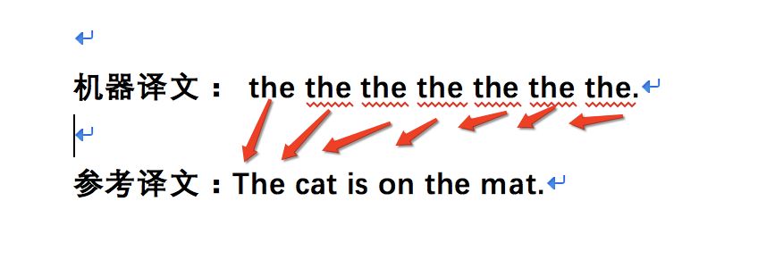 原文:猫坐在垫子上机器译文: the the the the the the the.参考译文:The cat is on the mat.