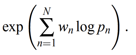 $ \sum_{i=1}^{N}w_n\log P_n=0.25\log P_1+0.25\log P_2+0.25\log P_3+0.25\log P_4= -0.5198603854199589 $