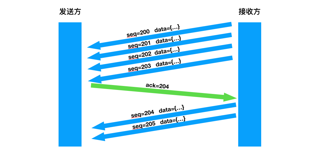 一样的也是采用的 ACK 机制,但是注意一点的是,并非对于每一个报文段都进行确认,而仅仅对最后一个报文段确认,捎带的确认了上图中的 203 号及以前的报文。 总结:从上面可以看到累计确认的效率更加高,首先他的确认包少一些那么也就是在网络中出现的大部分是需要传输的数据,而不是一半的数据一半的 ACK ,然后我们在第二张图中可以看到我们是可以连续发送多个报文段的(究竟一次性能发多少这个取决于发送窗口,而发送窗口又是由接受窗口和拥塞窗口一起来决定的。),一次性发多个数据会提高网络的吞吐量以及效率这个可以证明,比较简单这里不再赘述!
