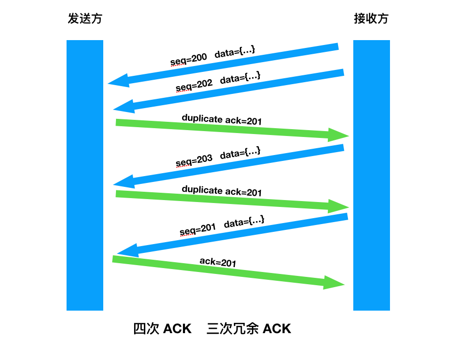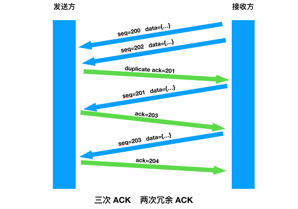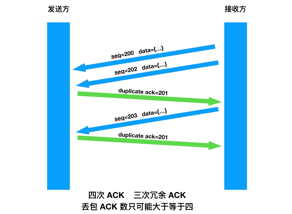 第三种情况,收到比期望序号大的数据的时候立即发送冗余 ACK ,ACK 确认的值就是中间缺少的第一个序号的值。