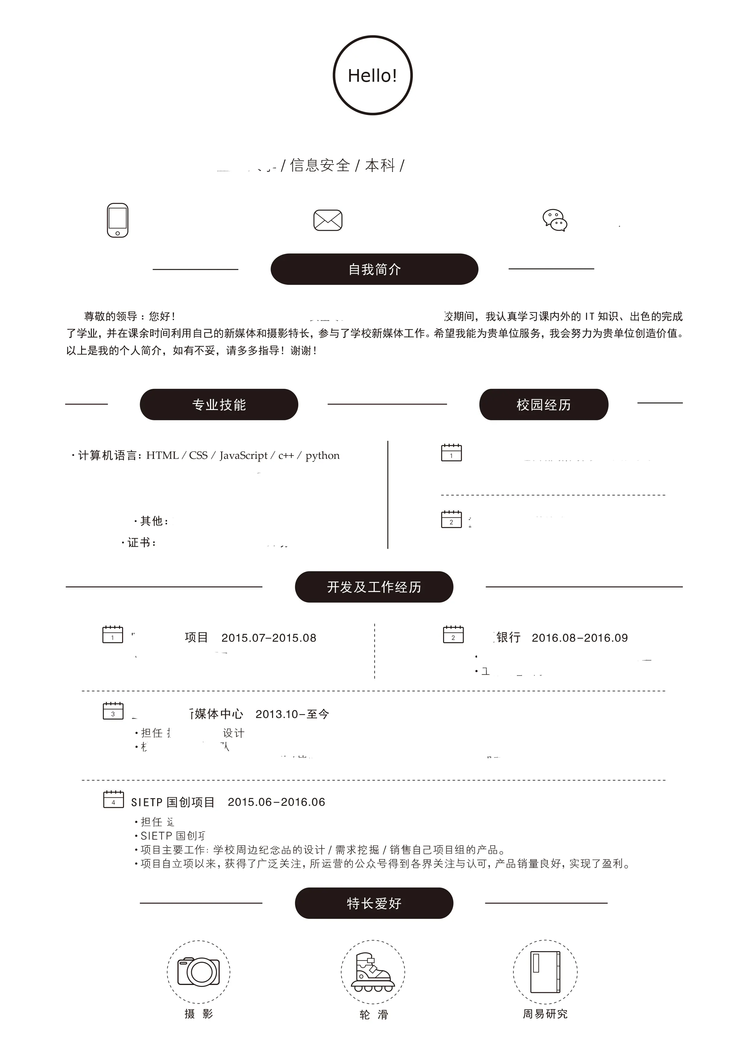 简历是一个很玄学的东西,一份好的简历能让你加分很多,比拍个好看的证件照有用多了!网上有很多很多的简历模板和攻略,不过我强烈推荐去找一个犀利的设计师or在比较好的艺术院校读平面设计&视觉传达的同学帮忙排简历,专业学习过平面设计的人,排出来的简历可以让hr耳目一新,毕竟99%的应届生都没有排版设计意识和审美意识。