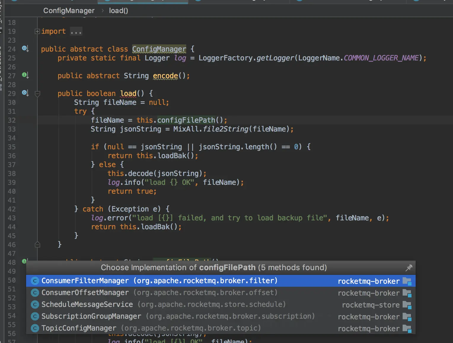 这个部分,会从外存总加载各个模块的配置信息,包括:topicConfigManager、consumerOffsetManager、subscriptionGroupManager、consumerFilterManager、messageStore。这里代码写得非常漂亮,使用了配置外化的思路和实现、应用了模板设计模式、插件设计模式和工厂设计模式。