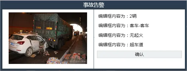 上图中的各种设备都可以双击,此时 camera 的位置会从当前位置移动到双击的设备的正前方;隧道入口的展示牌会自动轮播,出现事故时会展示牌中的内容会由“限速80,请开车灯”变为“超车道两车追尾,请减速慢行”;两隧道中间的逃生通道上方的指示牌是可以点击的,点击切换为蓝绿色激活状态,两旁的逃生通道门也会打开,再单击指示牌变为灰色,门关闭;还有一个事故现场模拟,双击两旁变压器中其中一个,在隧道内会出现一个“事故现场图标”,单击此图标,出现弹出框显示事故等等等等。