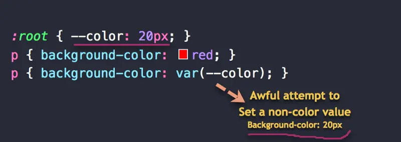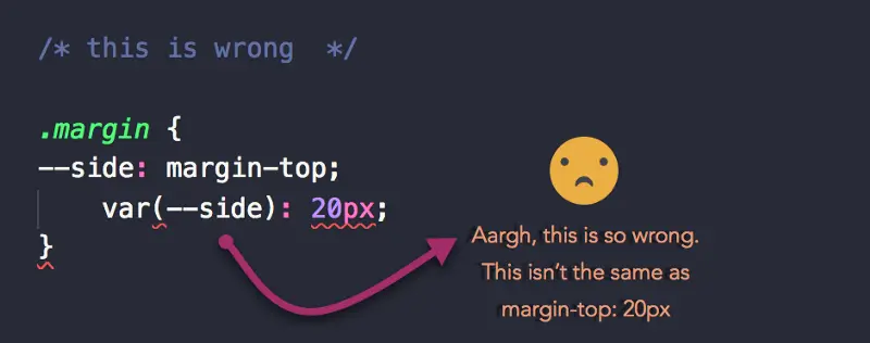 另一个重要的注意事项是,在 Sass 这类预处理器中,你可以在任意地方使用变量,做各种计算,但是需要注意,在原生 CSS 中,你只能将变量设置为属性值。