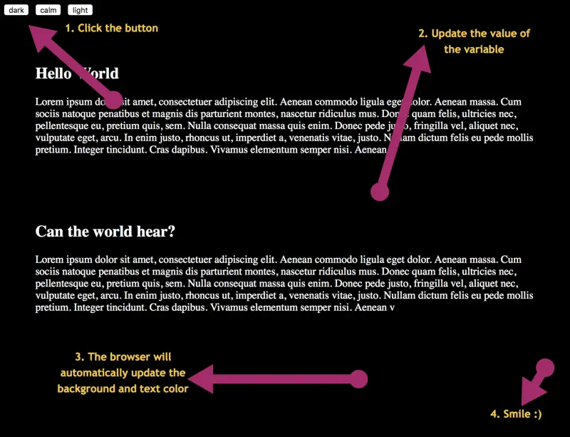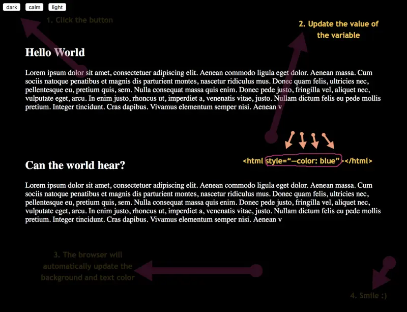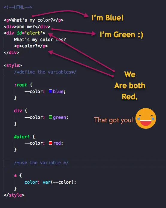 首先我将带你粗略过一遍 CSS 变量的基础知识。我相信任何理解 CSS 变量的尝试都必须从这里开始。