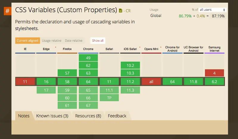 对于 CSS 变量的(又名自定义属性)浏览器支持并不差。 浏览器支持性非常好,基本所有的现代浏览器都支持良好(本文写作时已超过 87%)。