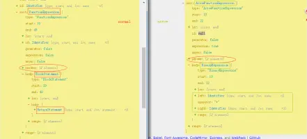 第一步:我们先来对比普通函数和箭头函数的抽象语法树,通过对比找出其中的不同之处,然后在节点可以复用的前提下,尽可能少的改变一下不同的地方,从而成功的将箭头函数转化为普通函数。
