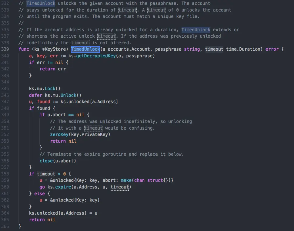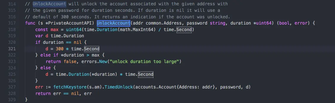 漏洞的关键组成,由未鉴权的RPC API服务及解锁账户后有一定的免密码时间相结合,以下是解锁账户的unlockAccount函数: