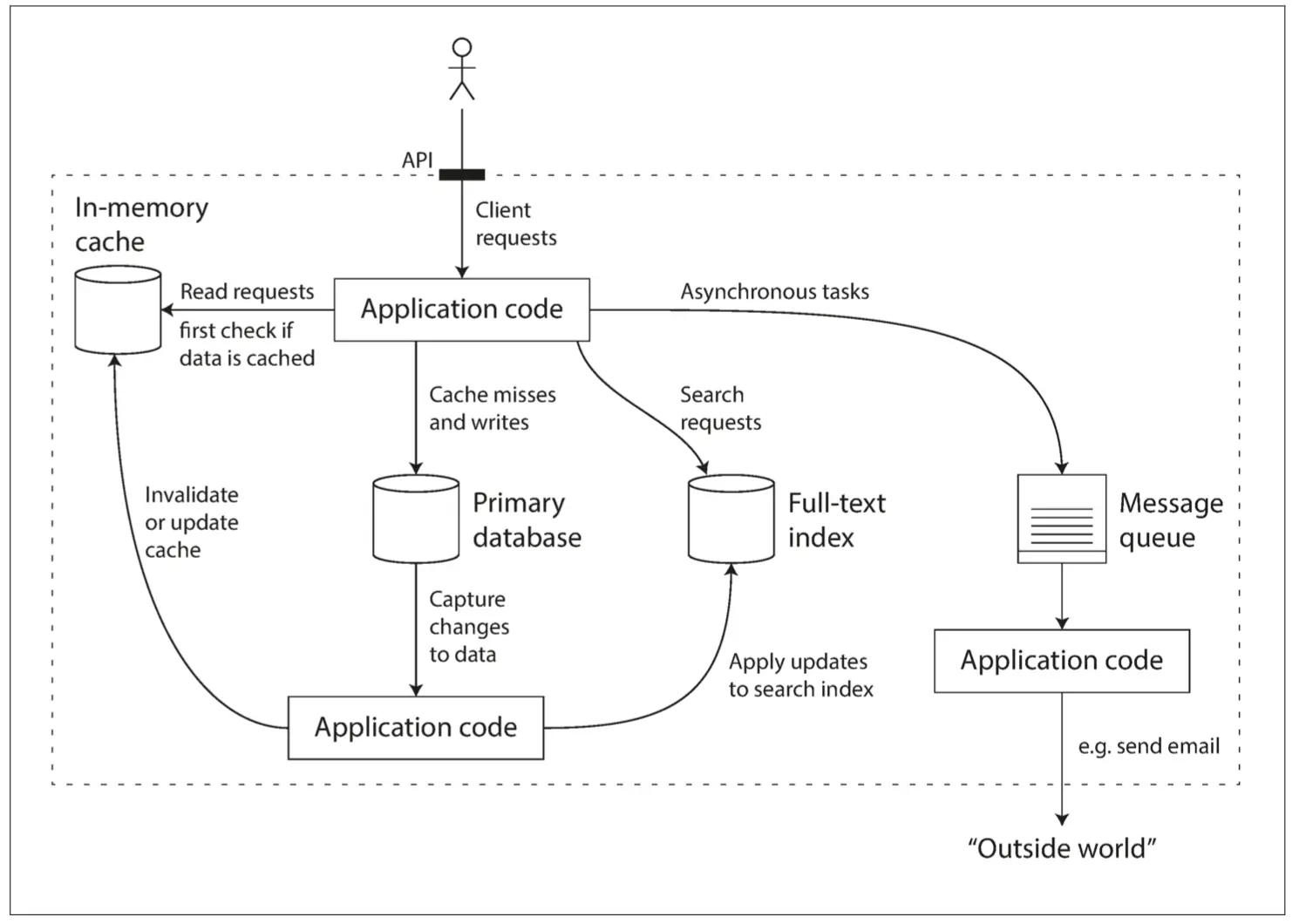 当你将多个工具组合在一起提供服务时,服务的接口或**应用程序编程接口(API, Application Programming Interface)**通常向客户端隐藏这些实现细节。现在,你基本上已经使用较小的通用组件创建了一个全新的、专用的数据系统。这个新的复合数据系统可能会提供特定的保证,例如:缓存在写入时会作废或更新,以便外部客户端获取一致的结果。现在你不仅是应用程序开发人员,还是数据系统设计人员了。