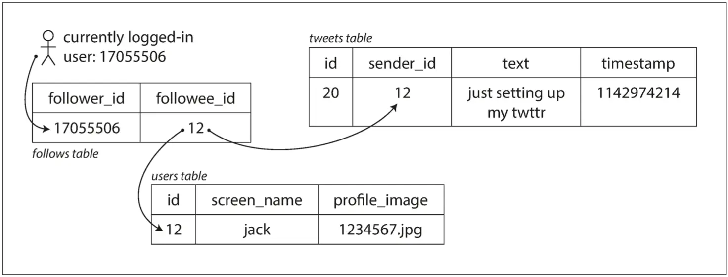 SELECT tweets.*, users.* FROM tweets JOIN users ON tweets.sender_id = users.id JOIN follows ON follows.followee_id = users.id WHERE follows.follower_id = current_user图1-2 推特主页时间线的关系型模式简单实现