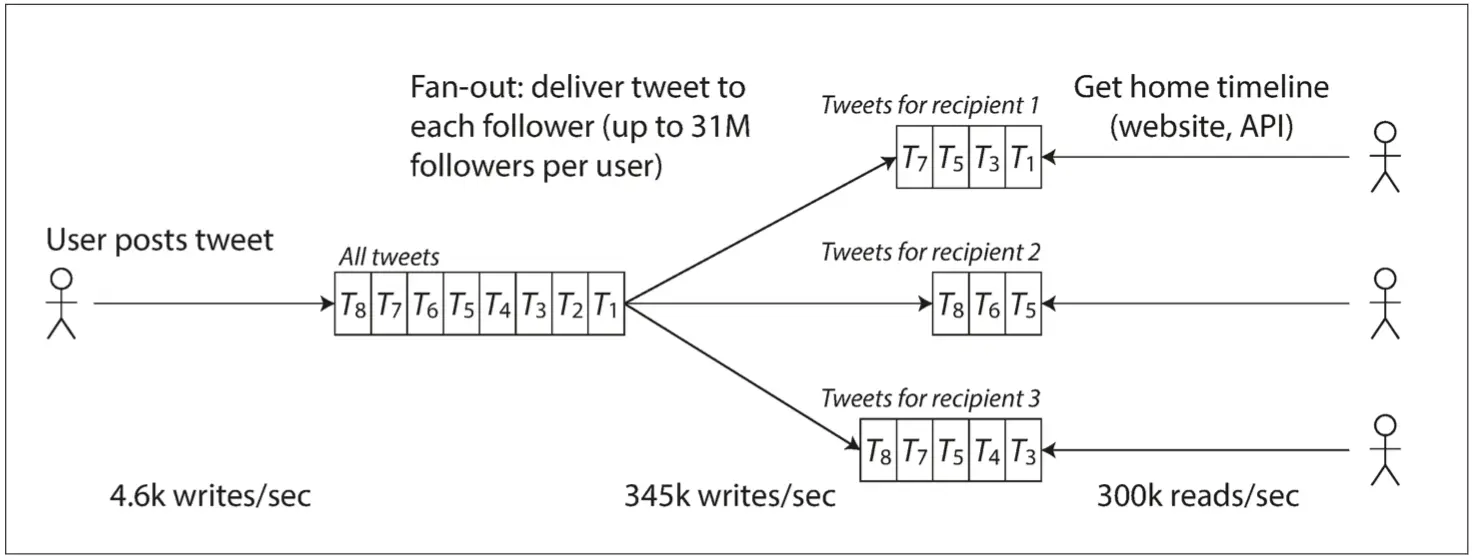 处理每秒12,000次写入(发推文的速率峰值)还是很简单的。然而推特的扩展性挑战并不是主要来自推特量,而是来自扇出(fan-out)——每个用户关注了很多人,也被很多人关注。