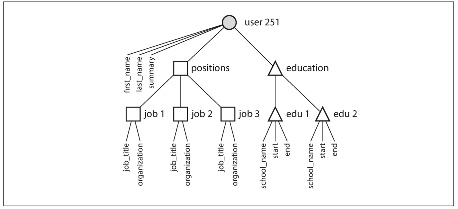 从用户配置文件到用户位置,教育历史和联系信息的一对多关系意味着数据中的树状结构,而JSON表示使得这个树状结构变得明确(见图2-2)。