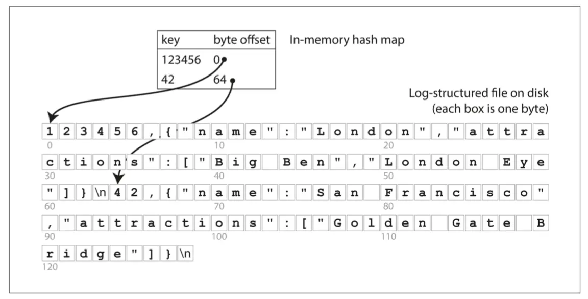 键值存储与在大多数编程语言中可以找到的字典类型非常相似,通常字典都是用散列表(哈希表)实现的。哈希映射在许多算法教科书中都有描述【1,2】,所以我们不会详细讨论它们工作方式。既然我们已经有内存数据结构——HashMap,为什么不使用它们来索引在磁盘上的数据呢?