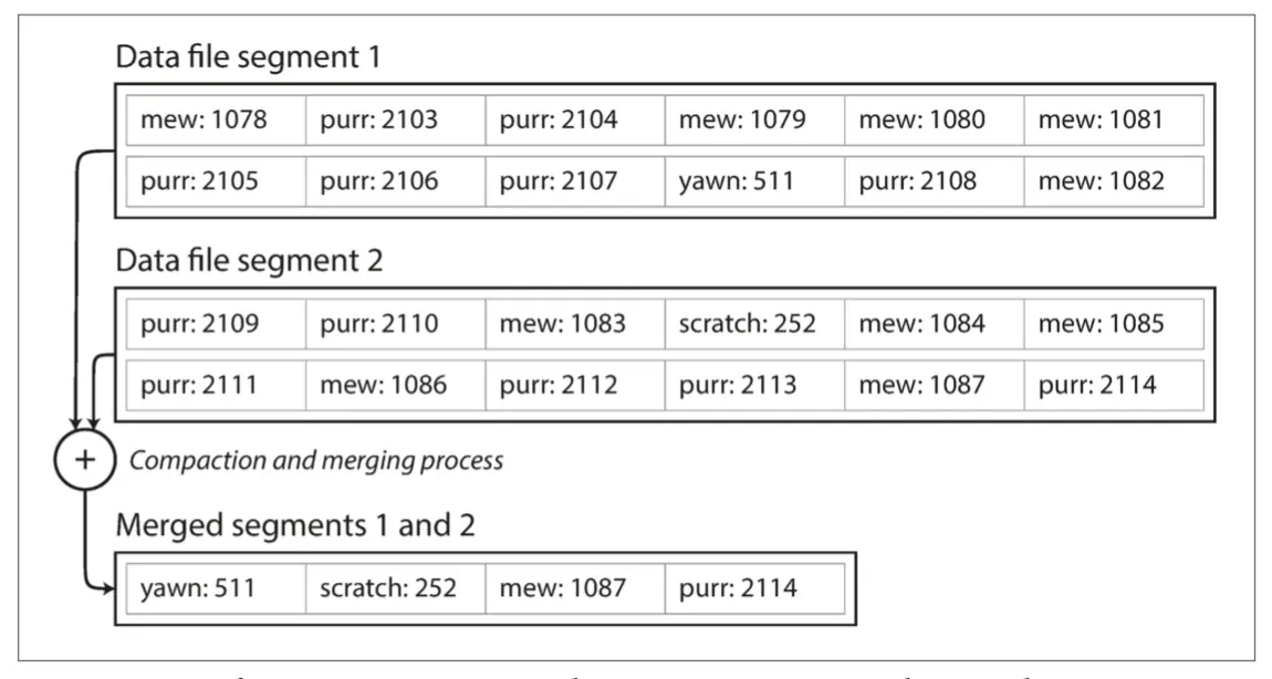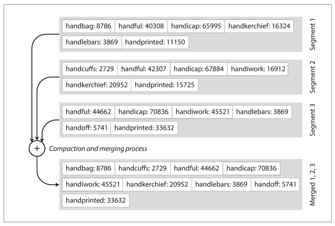 如果在几个输入段中出现相同的键,该怎么办?请记住,每个段都包含在一段时间内写入数据库的所有值。这意味着一个输入段中的所有值必须比另一个段中的所有值更新(假设我们总是合并相邻的段)。当多个段包含相同的键时,我们可以保留最近段的值,并丢弃旧段中的值。