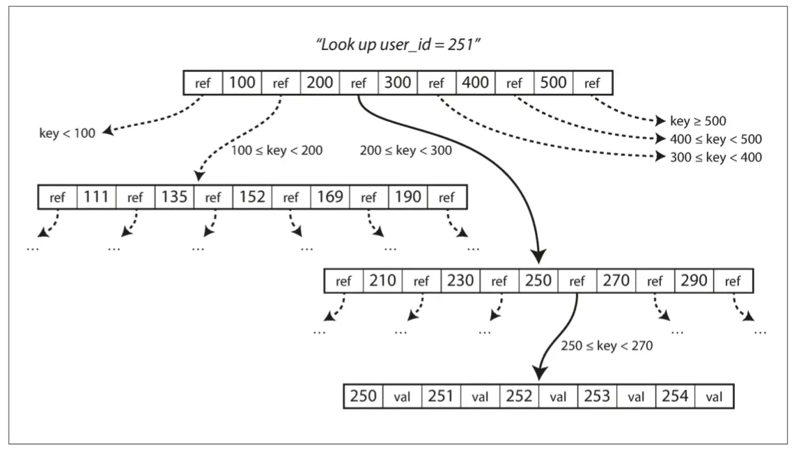 一个页面会被指定为B树的根;在索引中查找一个键时,就从这里开始。该页面包含几个键和对子页面的引用。每个子页面负责一段连续范围的键,引用之间的键,指明了引用子页面的键范围。