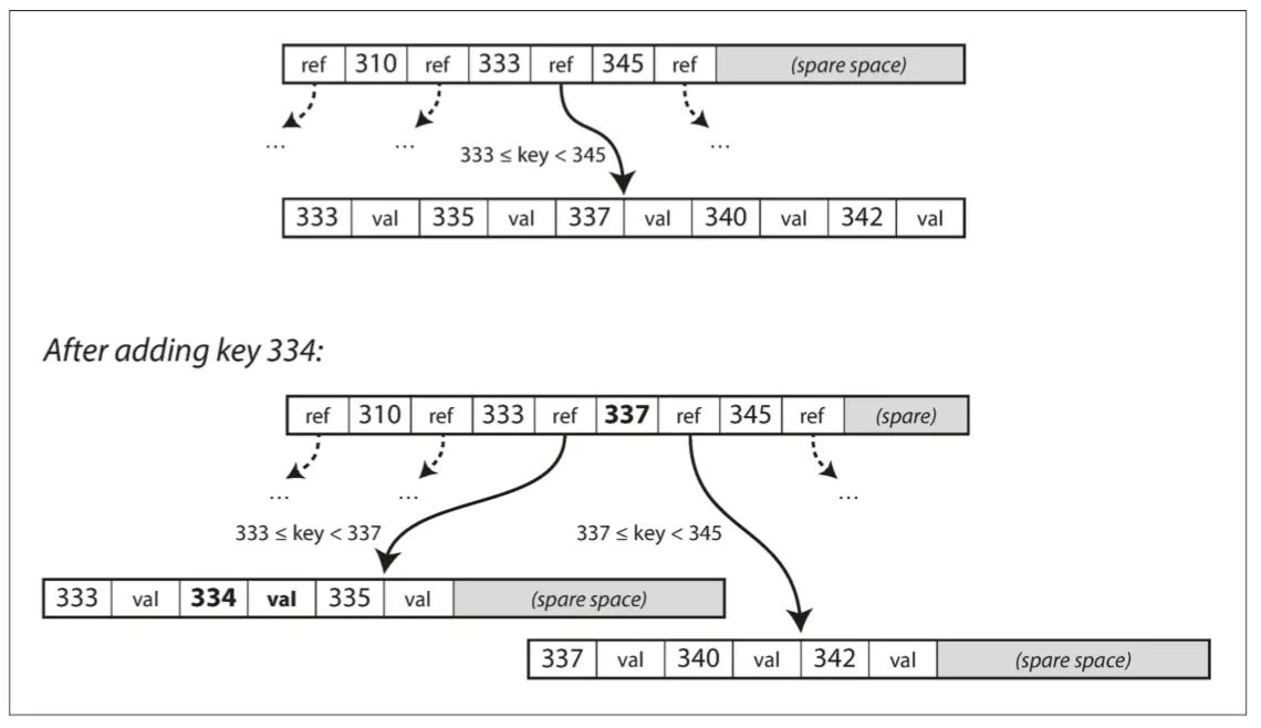 像SSTables一样,B树保持按键排序的键值对,这允许高效的键值查找和范围查询。但这就是相似之处的结尾:B树有着非常不同的设计理念。
