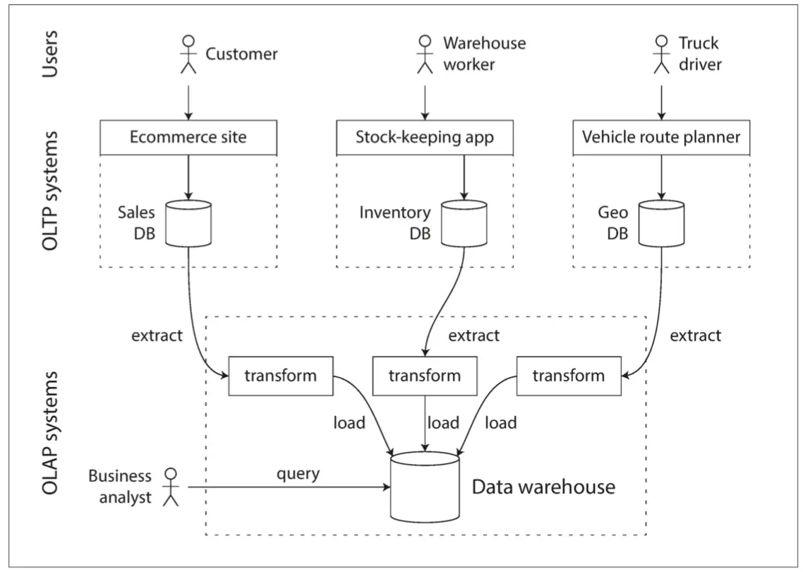 - 数据仓库和类似的分析系统不太知名,因为它们主要由业务分析人员使用,而不是由最终用户使用。它们处理比OLTP系统少得多的查询量,但是每个查询通常要求很高,需要在短时间内扫描数百万条记录。磁盘带宽(不是查找时间)往往是瓶颈,列式存储是这种工作负载越来越流行的解决方案。