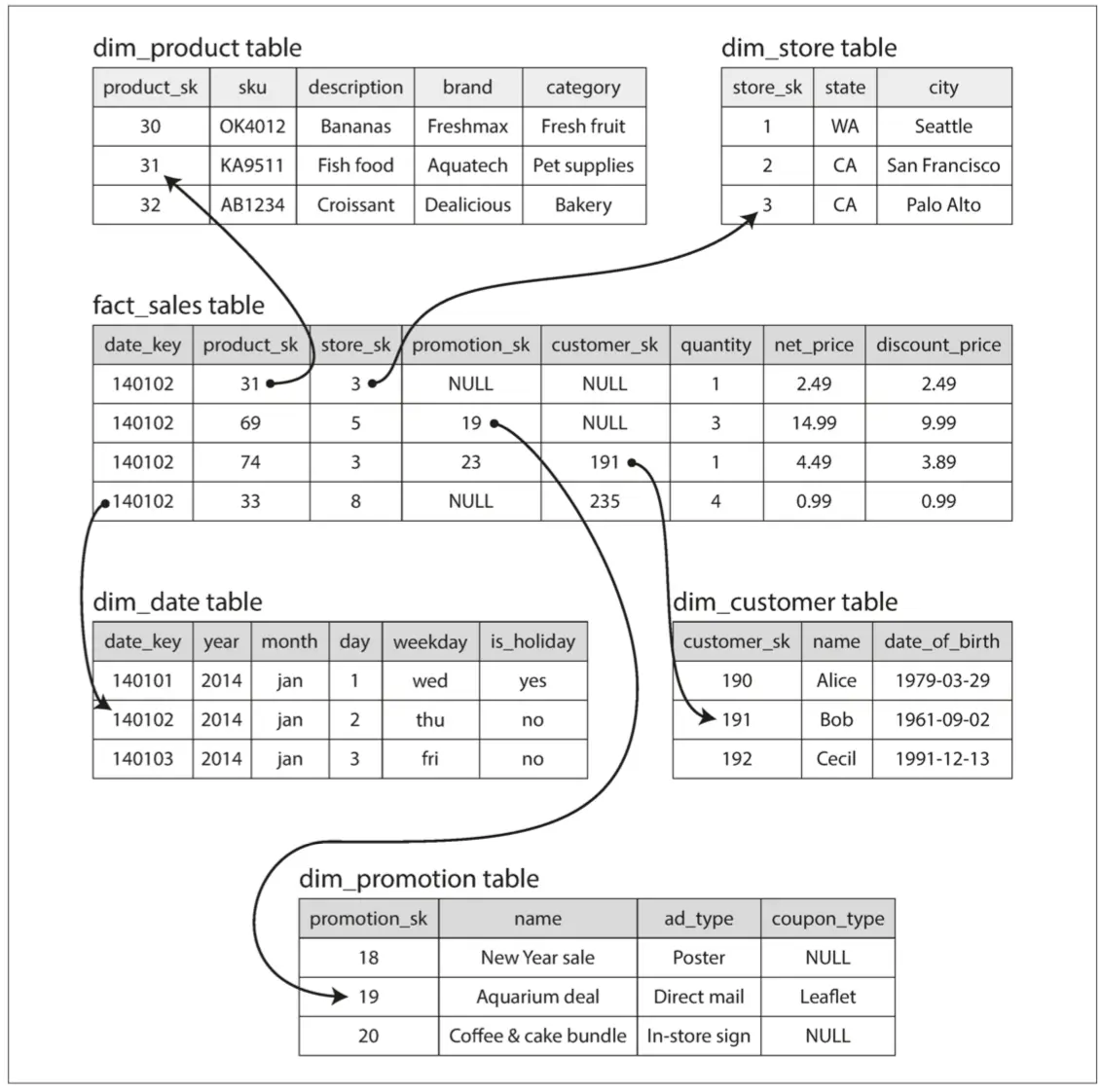 一般来说,事实往往有两个以上的维度。在图3-9中有五个维度:日期,产品,商店,促销和客户。要想象一个五维超立方体是什么样子是很困难的,但是原理是一样的:每个单元格都包含特定日期(产品 - 商店 - 促销 - 客户组合)的销售。这些值可以在每个维度上重复概括。
