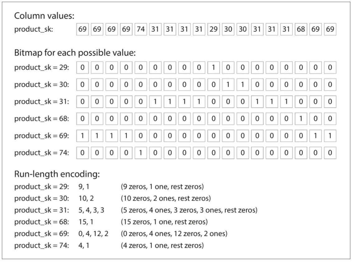 排序顺序的另一个好处是它可以帮助压缩列。如果主要排序列没有多个不同的值,那么在排序之后,它将具有很长的序列,其中相同的值连续重复多次。一个简单的运行长度编码(就像我们用于图3-11中的位图一样)可以将该列压缩到几千字节——即使表中有数十亿行。