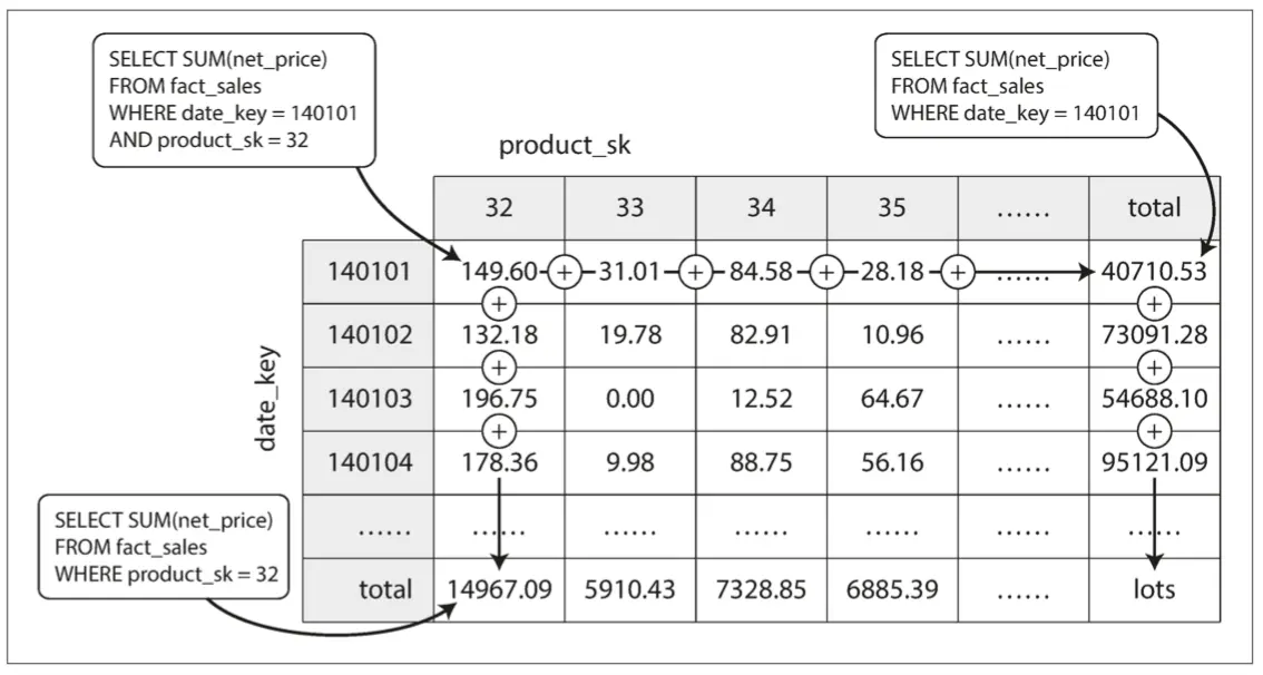 物化数据立方体的优点是某些查询变得非常快,因为它们已经被有效地预先计算了。例如,如果您想知道每个商店的总销售额,则只需查看合适维度的总计,无需扫描数百万行。
