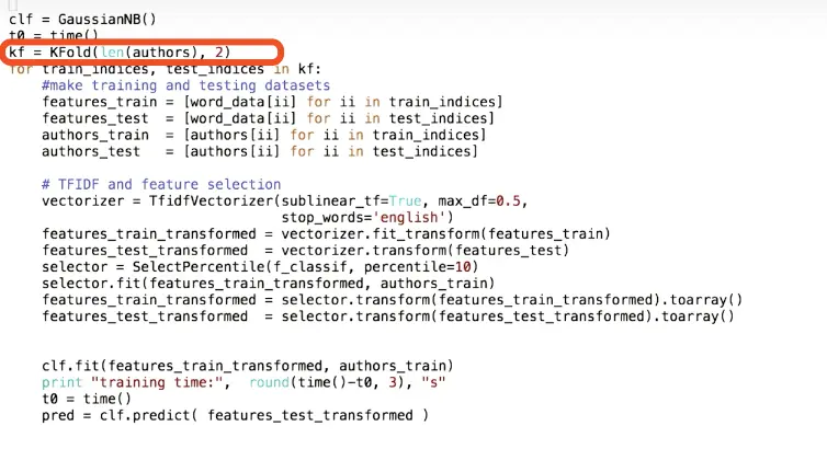 红色部分标记出的cv = KFold( len(authors), 2 )