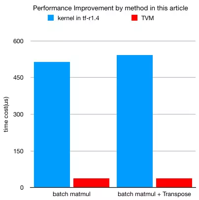 我们的实践结果表明,通过 TVM 生成的内核(优化了 schedule )可以使批量 matmul 计算速度提高至少 13 倍,并且在启用了算子融合的情况下还将进一步提高速度。