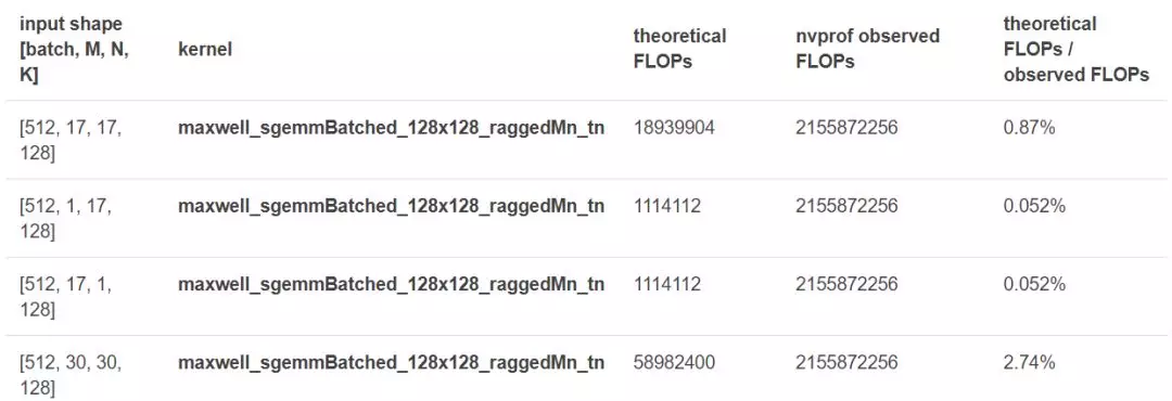 即使使用不同的 shape(改变 M , N , K),所有的 Maxwell_sgembatched_128x128_raggedMn_tn 调用都会执行相同数量的 FLOP,而且实际值比理论值大得多。可以推断,所有这些不同的 shape 可能都被填充成了特定的 shape。在所有这些 shape 中,即使在最好的情况下,理论 FLOP 仍仅占实际执行 FLOP 的 2.74%,因此大部分计算相当冗余。类似地,调用另一个 cuBLAS 内核的 Maxwell_sgembatched_64x64_raggedMn_tn 出现了同样的现象。