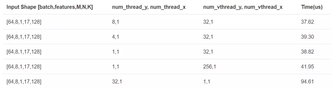 根据以往的经验,寻找 num_thread_y 和 num_thread_x 最佳组合的方法是暴力搜索。通过暴力搜索,可以找到当前形状(shape)的最佳组合,我们在当前计算中得到的最佳组合为 num_thread_y=8,num_thread_x=32。