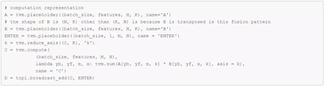 批量 matmul 和广播加法融合计算可声明如下: